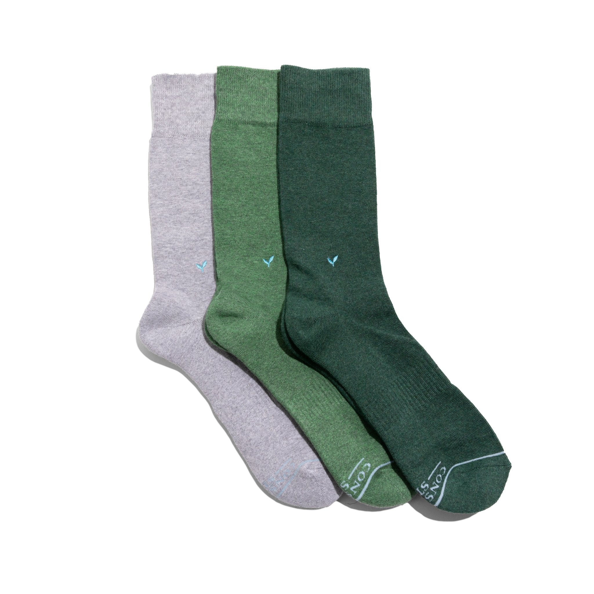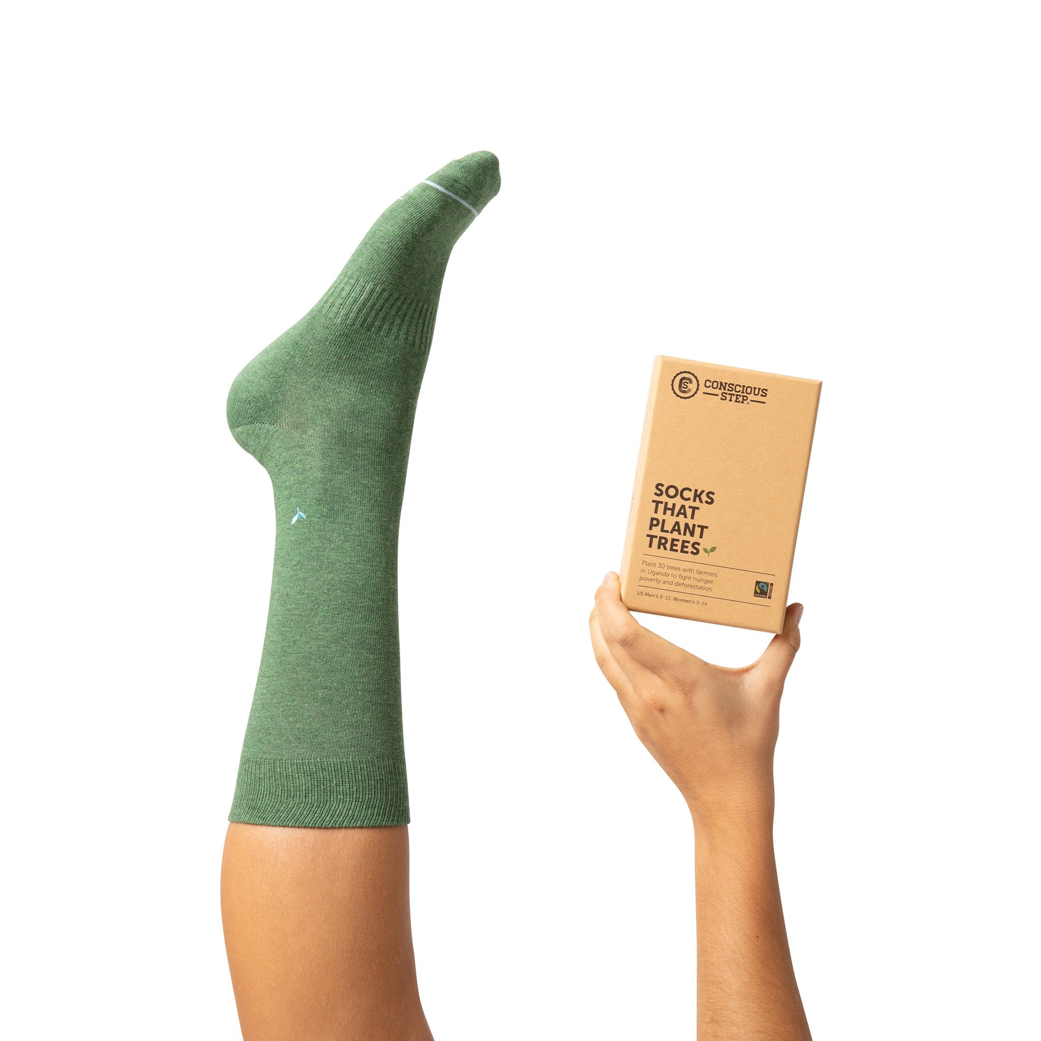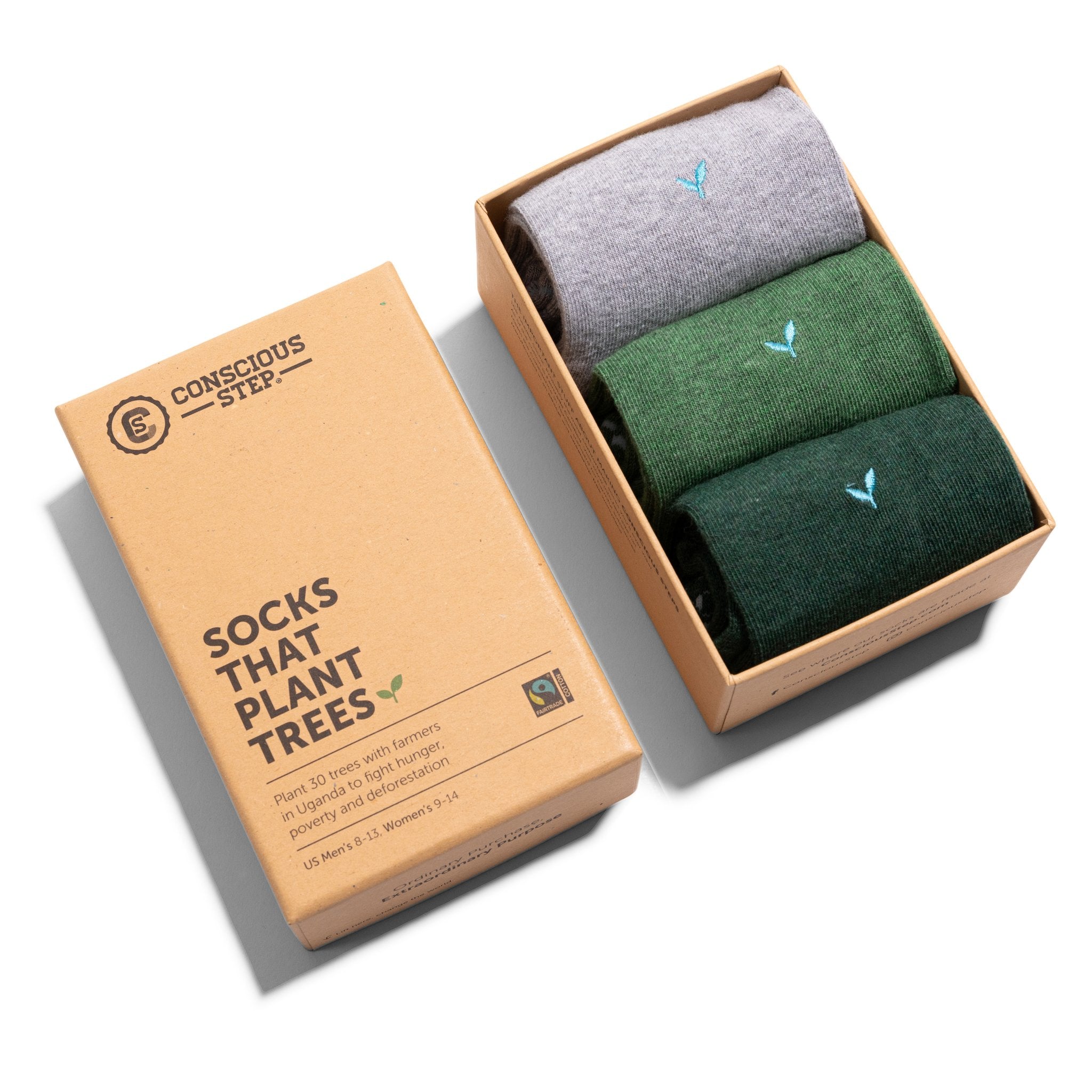 Sokkarnir koma 3 saman í fallegum gjafakassa, eitt par grátt, eitt grænt og eitt dökkgrænt. Hvert skipti sem sokkapar er keypt eru 10 tré gróðursett, 30 tré fyrir einn kassa. Sokkarnir eru sértaklega sætir, notalegir, mjúkir, þykkir og með auka bólstrun undir ilinni. Sokkarnir koma í medium (41-47) og small (36-40).