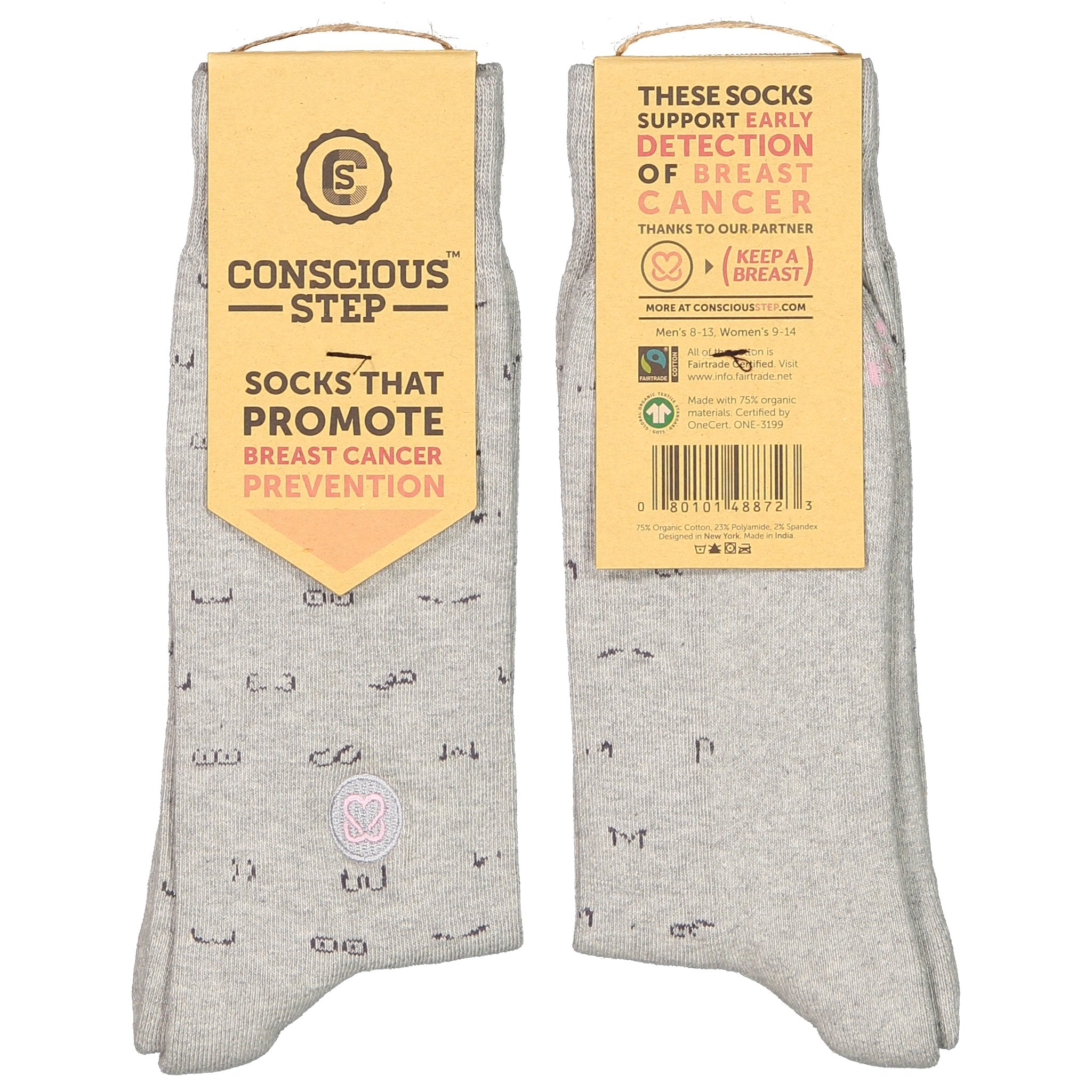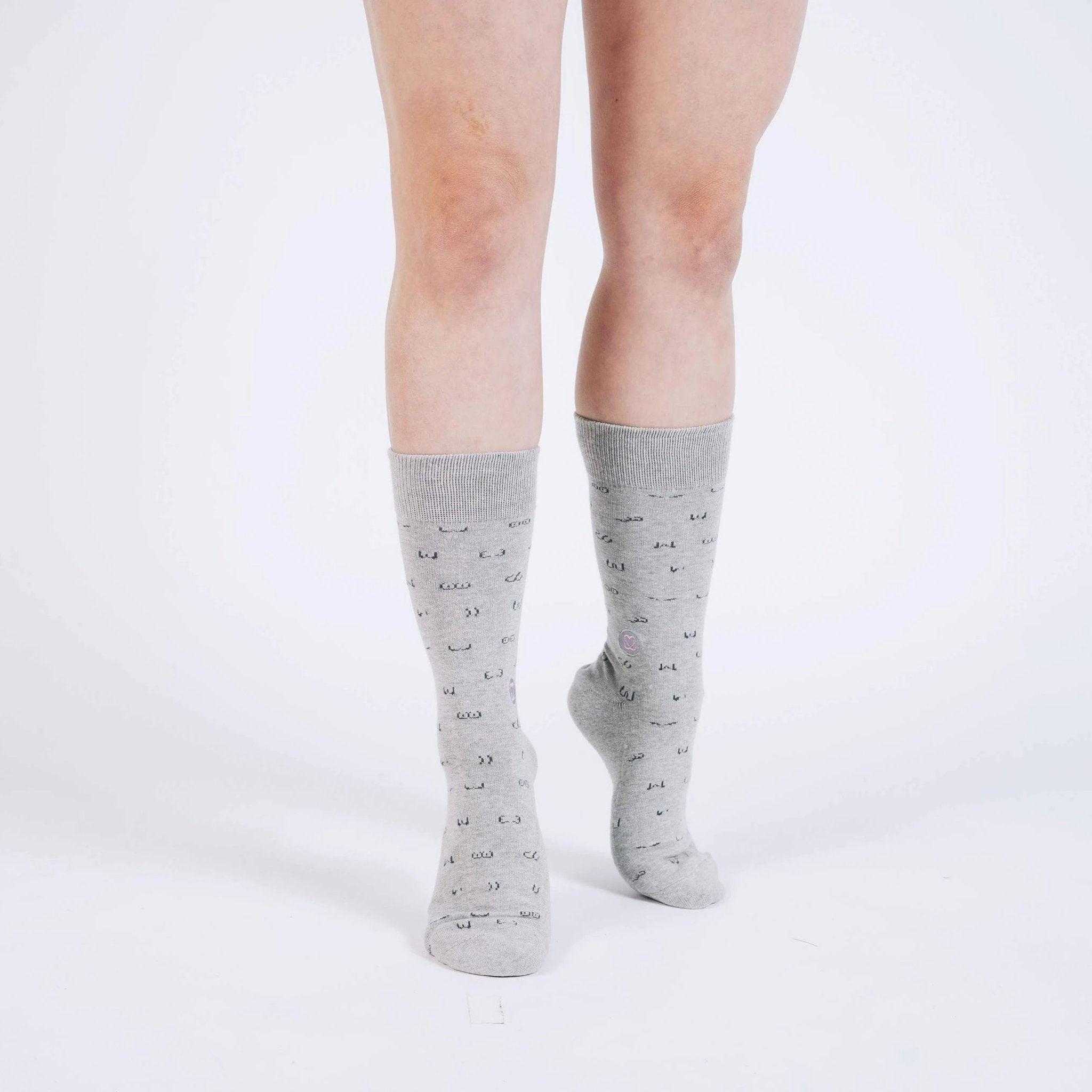 Hvert sokkapar styður félagasamtökin Keep A Breast við vinnu þeirra við að fræða ungt fólk um forvarnir brjóstakrabbameins, hluti af söluverðinu fer til þeirra. Sokkapörin eru ljósgrá með svörtu mynstri. Þetta er falleg gjöf sem gefur áfram fyrir þann sem þér þykir vænt um.